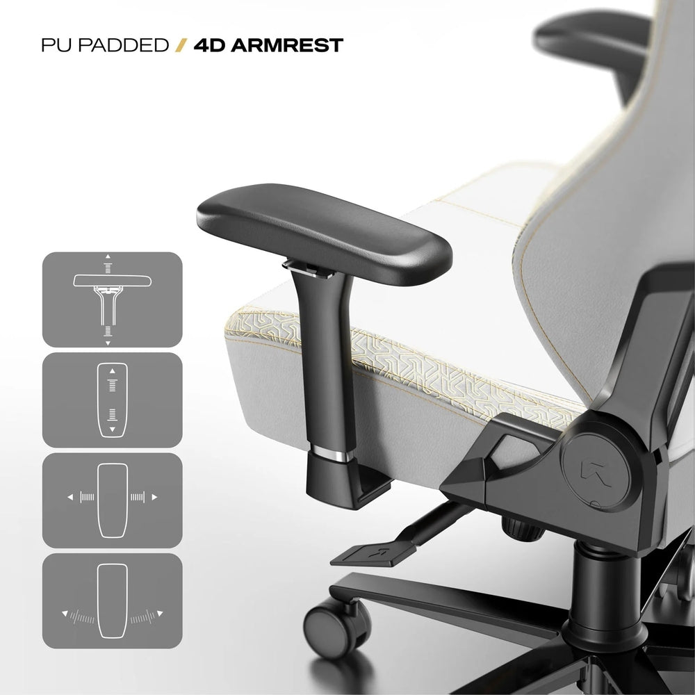 • 4D ARM REST - Versatile movement such as Height up and down, Width Adjustment -Left and Right, Length Adjustment -Forward and Backward & Angle Swivel left and right upto 45°.