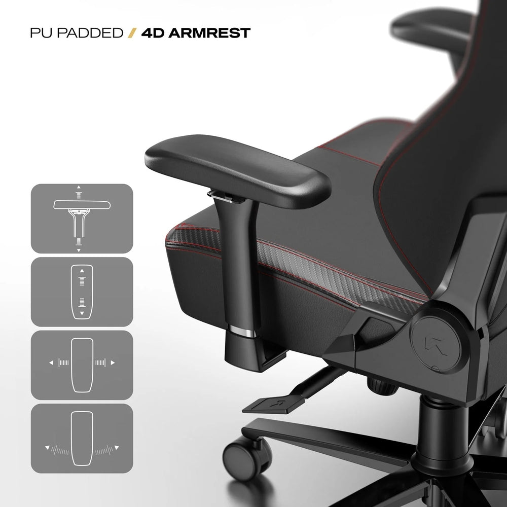 Find your perfect position with versatile 4-way adjustability. The PU-padded armrests can be moved Up/Down, Left/Right, Forward/Backward, and Swiveled (up to 45°) to support your elbows and reduce shoulder strain during intense gameplay.