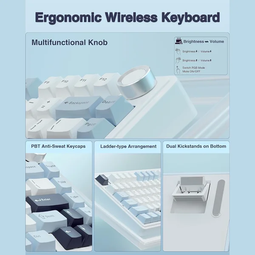 The AULA F75 Ice Blue is a compact 75% TKL mechanical keyboard designed for gamers and creators who want style and performance in a small footprint. Its gasket-mounted design with PBT keycaps delivers a comfortable, low-noise typing experience. Triple connectivity (USB-C, Bluetooth 5.1, 2.4GHz) allows seamless device switching. The rotary knob enables quick volume control and custom commands, while Reaper switches provide a smooth, linear typing feel.