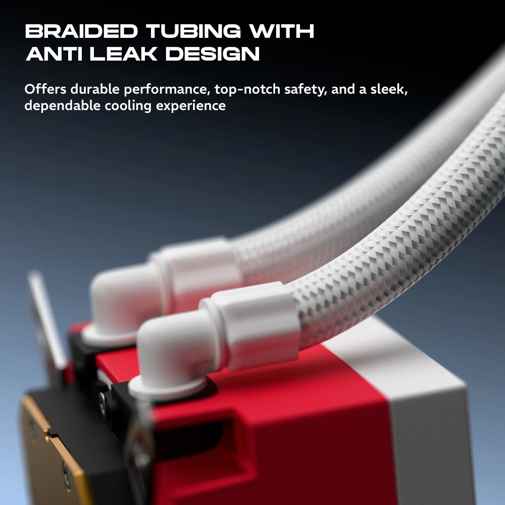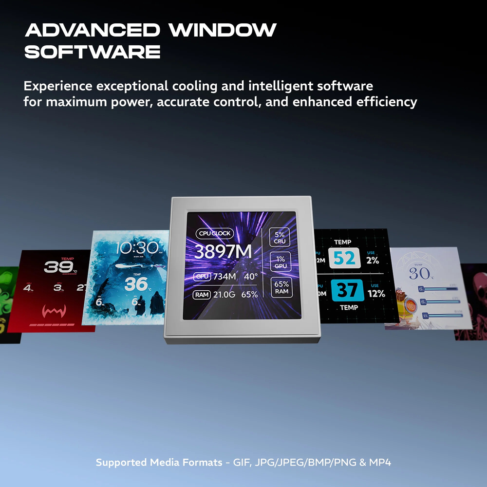 The standout feature is the detachable 3.4″ IPS square display on the pump block — capable of showing real-time CPU temperatures, GIFs, JPEGs, PNGs, or even MP4 videos, fully customisable via advanced Windows software. Motherboard ARGB Sync ties the cooler's lighting into your system's full RGB ecosystem, while braided tubing ensures durability and a premium look that lasts.