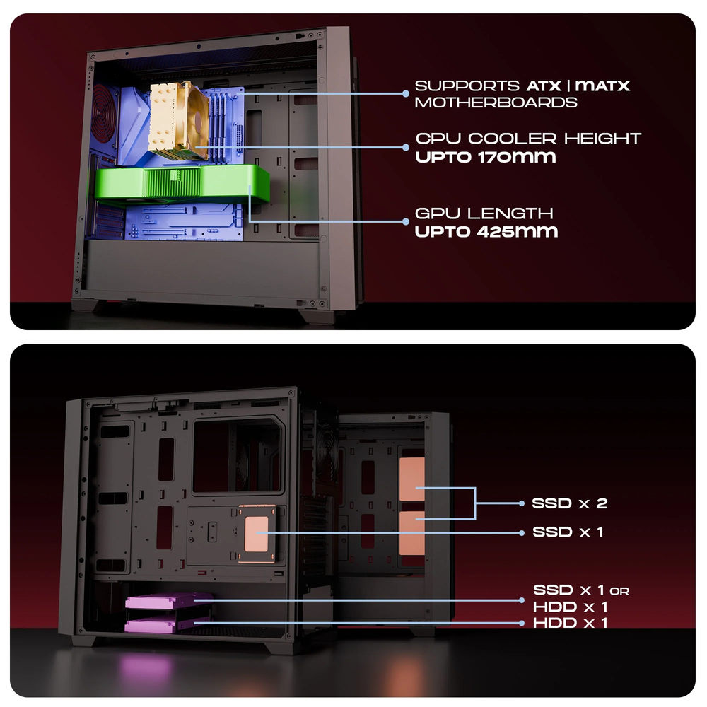 • Pre-installed fans: 4x ARGB Hexa Pattern, Center & Side Infinity Mirror Glow fans