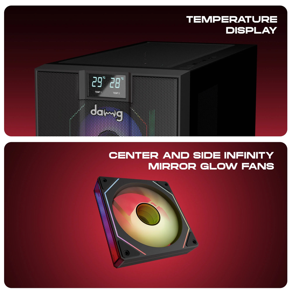 The Dawg X 678 Mid Tower ARGB Gaming Chassis takes your build to the next level with Hexa Pattern Infinity Mirror Glow fans, a tempered glass side panel, and a built-in temperature display. Supporting ATX/mATX builds, it delivers stunning aesthetics, excellent airflow, and 360mm AIO compatibility.