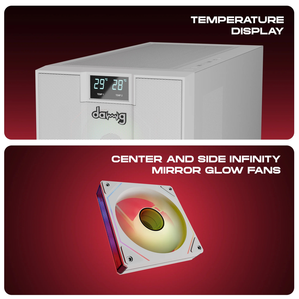 The Dawg X 678 Mid Tower ARGB Gaming Chassis takes your build to the next level with Hexa Pattern Infinity Mirror Glow fans, a tempered glass side panel, and a built-in temperature display. Supporting ATX/mATX builds, it delivers stunning aesthetics, excellent airflow, and 360mm AIO compatibility.