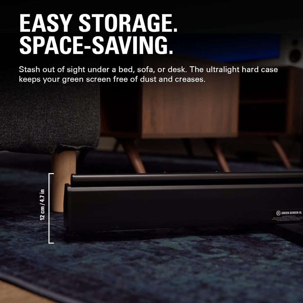 Pull the handle, and the pneumatic x-frame locks itself open in seconds. No clamps, no assembly, no frustration. The 100% Dacron® by DuPont polyester fabric is wrinkle-resistant and anti-reflective so chroma keying in OBS, Streamlabs, Teams, Zoom, or any editing software stays clean and accurate with minimal touchup. When you are done, it collapses back down to just 210×12×12cm and stores away in the included ultralight hard case — dust-free, crease-free, and ready to go again tomorrow.